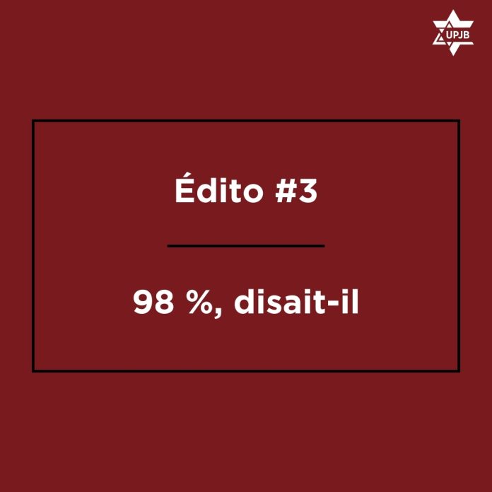 L’UPJB – qui compte plus de 250 membres cotisants – et les autres collectifs de Juif/ves critiques nés plus récemment au sein de la communauté juive de Belgique n’ont jamais eu la prétention d’être « représentatifs » de toute cette communauté. Mais la fable des 98 % et nous traiter par le mépris, ça commence à bien faire.