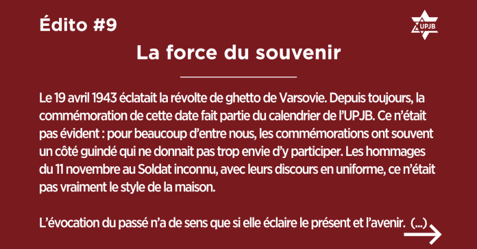Le 19 avril 1943 éclatait la révolte de ghetto de Varsovie. Depuis toujours, la commémoration de cette date fait partie du calendrier de l’UPJB. Ce n’était pas évident : pour beaucoup d’entre nous, les commémorations ont souvent un côté guindé qui ne donnait pas trop envie d’y participer. Les hommages du 11 novembre au Soldat inconnu, avec leurs discours en uniforme, ce n’était pas vraiment le style de la maison.