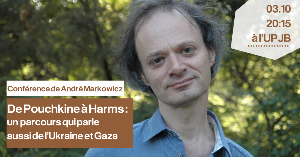 André Markowicz nous est connu sous de multiples facettes. Passeur de la culture russe vers le monde francophone. Traducteur, auteur, poète, chroniqueur, éditeur. Tant d’autres étiquettes pourraient lui être collées à la peau. De l’immense travail accompli pour restituer l’écriture de Dostoïevski en français à ses chroniques régulières sur Facebook. C’est une vie de l’entre-deux : entre la France et la Russie, entre la judéité qui marque fortement son histoire familiale et la revendication d’un humanisme universaliste, sans complexe par rapport aux identitaires de tout acabit. Homme de l’art et personne engagée dans des combats politiques : aux côtés de la résistance populaire en Ukraine et de l’opposition anti-guerre en Russie, pour les droits du peuple palestinien, se démarquant des nationalismes et revendiquant la liberté de la culture, son indépendance face aux diktats de la politique. Il évoquera quelques jalons importants de ses activités récentes en partant de son « Dictionnaire amoureux de Pouchkine » paru cette année. Rarement le titre de cette collection a correspondu aussi exactement au rapport qu’entretient André Markowicz avec cet écrivain dont le rôle est unique dans la culture russe, qu’elle soit lettrée, raffinée, populaire, grivoise. Il nous parlera aussi de Daniil Harms, poète russe victime de la terreur stalinienne, dont les textes ont été miraculeusement sauvés d’un immeuble en ruines pendant le blocus de Léningrad et ont longtemps circulé comme des copies clandestines, de la main à la main, dans un pays où il était banni de prononcer le nom des poètes assassinés.