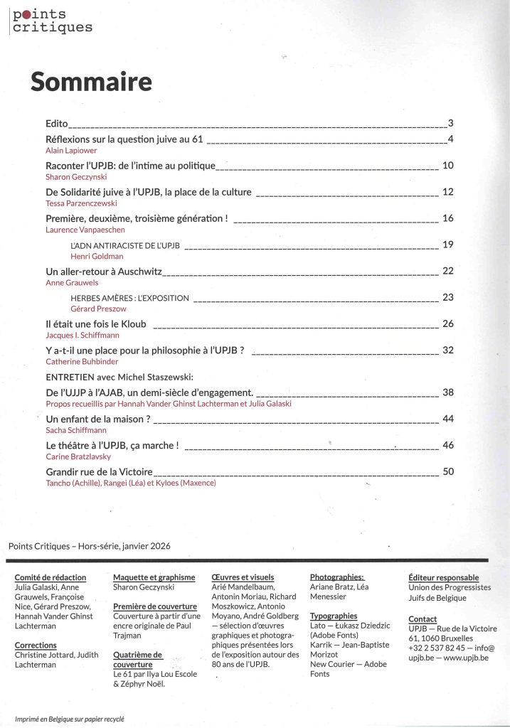 Mettre en page un numéro anniversaire n’est jamais un exercice simple. Lorsqu’il s’agit d’un numéro hors série qui célèbre les 80 ans de l’Union des Progressistes Juifs de Belgique – UPJB, l’enjeu dépasse largement la forme : il s’agit de rendre lisible une histoire collective, traversée par des engagements politiques, des débats internes, des héritages parfois conflictuels, des trajectoires humaines mais aussi des fragilités matérielles. La revue Points Critiques s’est ainsi arrêtée durant plusieurs années, faute de financements, avant de pouvoir être relancée à l’occasion de ce numéro hors série.