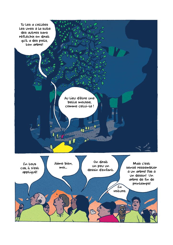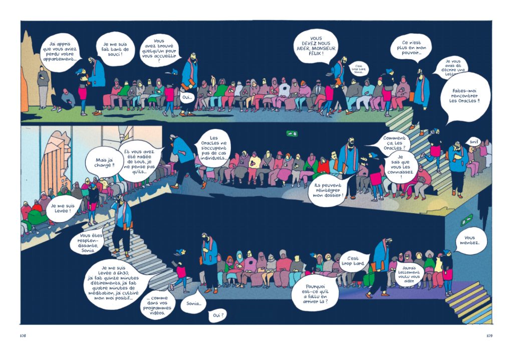 De cette proximité va naître une conspiration aux allures de farce politique dont nous ne dévoilerons, bien entendu, pas la fin. Ce qui frappe, c’est la manière dont cette réappropriation du destin se précipite en un refus tragi-comique du règne d’une raison malade par la grâce du dessin. La dystopie signée Raphaël Geffray qu’était La Gare[1] – ici en association avec Antonin Moriau pour le scénario – se prolonge et se transforme dans les couloirs labyrinthiques d’un empire moribond dont nous découvrons les coulisses à mesure que Sonia y pénètre avec un complice de fortune. Nous retrouverons alors Monsieur Félix cherchant, vainement, à plaider sa cause auprès du sommet de la pyramide pour la réintégrer sur le marché et lui rendre ainsi la seule valeur qui compte pour être digne d’exister dans ce monde. La façon dont le choc des couleurs et les traits des silhouettes se jouent ironiquement de la mystification du pouvoir pour en détourner les cadres esthétiques donne à la critique une valeur de chef-d’oeuvre de contre-violence. L’art minoritaire qu’est la bande dessinée se fait outil de lutte et de libération pour revisiter nos musées imaginaires, en piller les trésors, et n’en rapporter qu’un seul : le feu. Comme si, pour contrer la brutalité dissociative de l’époque, il fallait trouver des formes pour en témoigner non seulement afin de rendre compte de ce qui nous arrive, mais aussi pour inventer d’autres chemins qui mêlent le rêve au possible. Question de montage, d’agencement entre les cases, de dialogue entre les planches, de motifs qui reviennent, insistent, se font écho. Question de rythme, en somme. Modernité fulgurante de ce livre qui articule poétiquement le désir de raconter les cauchemars du présent avec un idéal de beauté réveillant un avenir commun.